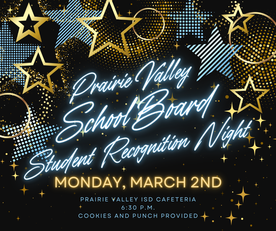 The PVISD School Board would like to recognize all students who competed and represented us so well in Cross Country, Football, Volleyball, Basketball, Elementary/JH UIL, Montague County Youth Fair, Prairie Valley FFA Chapter Show, and all FFA Stock Shows. This will be a big group of kids, so please come join us for cookies and punch for a reception honoring these students. They work so hard and our School Board wants to recognize their efforts and accomplishments!