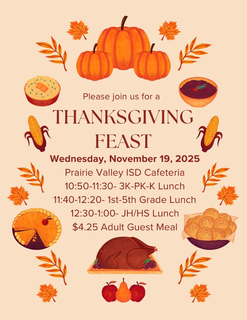 Next week on Wednesday, our awesome Child Nutrition ladies will be preparing a Thanksgiving feast for our students, faculty, and guests! Adult plates are $4.25. Please join us! 3K-PK-K will eat at 10:50, 1st through 5th will eat at 11:40, and JH/HS will eat at 12:30.